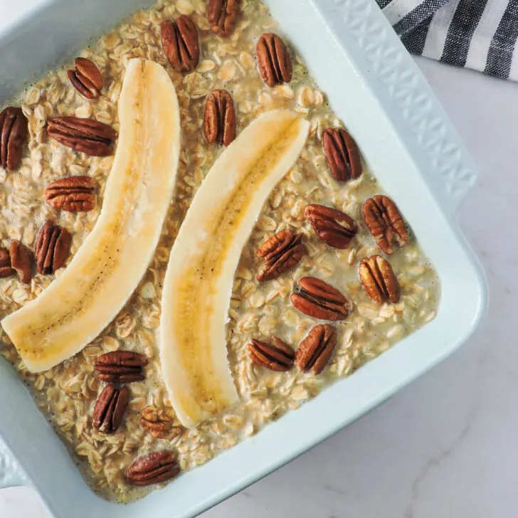 - Fold in the oats and pour mixture into an 8x8 pan coated with cooking spray. Halve the other banana and place it on top. Place the pecan halves on top as well if using. Bake at 350 degrees for 25-30 minutes or until set.