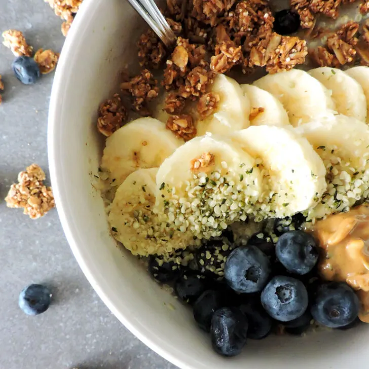 After you stir in the cinnamon and almond milk , you’ll just arrange some granola, hemp seeds, banana, blueberries and a dollop of almond butter on top. You have the softness in the oatmeal. The crunch of the granola and that creamy almond butter. Yum! Yum!
