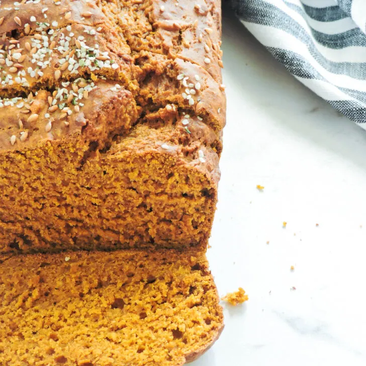 I like to top this pumpkin bread with shelled pumpkin seeds, hemp seeds or this amazing streusel topping. See the recipe card for the ingredients.