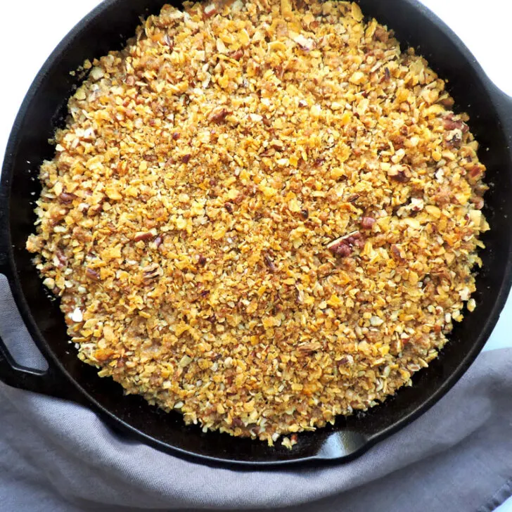 The crunchy pecan crumble has an unexpected ingredient, corn flakes! The corn flakes get extra crispy in the oven and they create that sweet and salty crumble texture you’re after. The butter is essential here to facilitate flavor and that crunchy texture. The food processor makes quick work of the crumble, but if you don’t have one, just put the pecans and corn flakes in a zip top bag to crush them. Beat them with a rolling pin or mallet. Get those aggressions out before family arrives 😉