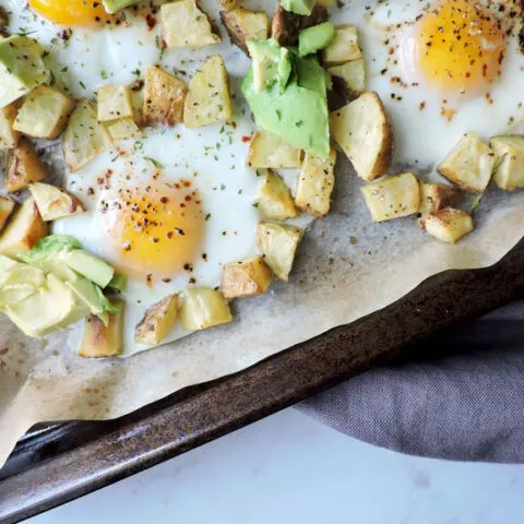 This Egg and Potato Sheet Pan Breakfast is absolutely basic and topped with Avocado. I like heat so I go for some crushed red pepper and plenty of black pepper. I think Trader Joe’s Everything But the Bagel Seasoning would also be good. I am so excited to make more of these. Sheet pan breakfast is definitely a game changer.
