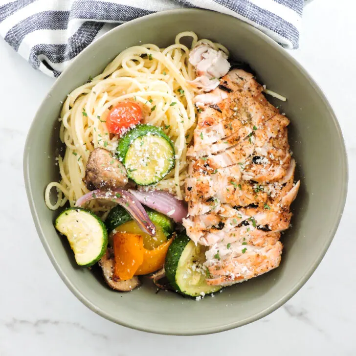- When your chicken and veggies are ready allow the chicken to rest for 10 minutes. Slice the chicken and serve with pasta, grilled veggies and a squeeze from your grilled lemon. Add extra parmesan and parsley for garnish and enjoy!