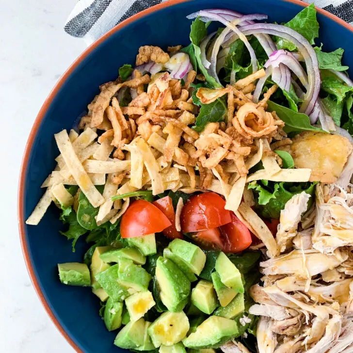 - Wash and cut up all of your salad ingredients. When you're ready to serve arrange the avocado, chicken, crispy tortilla strips and crispy onions on top. Dress it with some dressing, toss and serve.