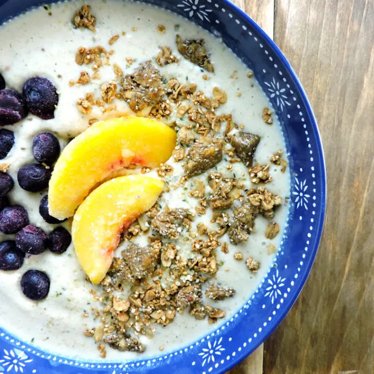 If you watch my instastories lately, you know I am on a smoothie kick. Mainly it’s a green smoothie with various fruits and don’t ever forget that almond butter. Sometimes I want something more substantial. Sometimes I am also out of greens. That’s how this Peach Perfect Smoothie Superfood Bowl came to be. I think kids would really enjoy this one. How fun to whirl this up and set out toppings. It’s still full of superfoods without having any spinach too. I know some people freak out when something is green. Specifically the little ones.