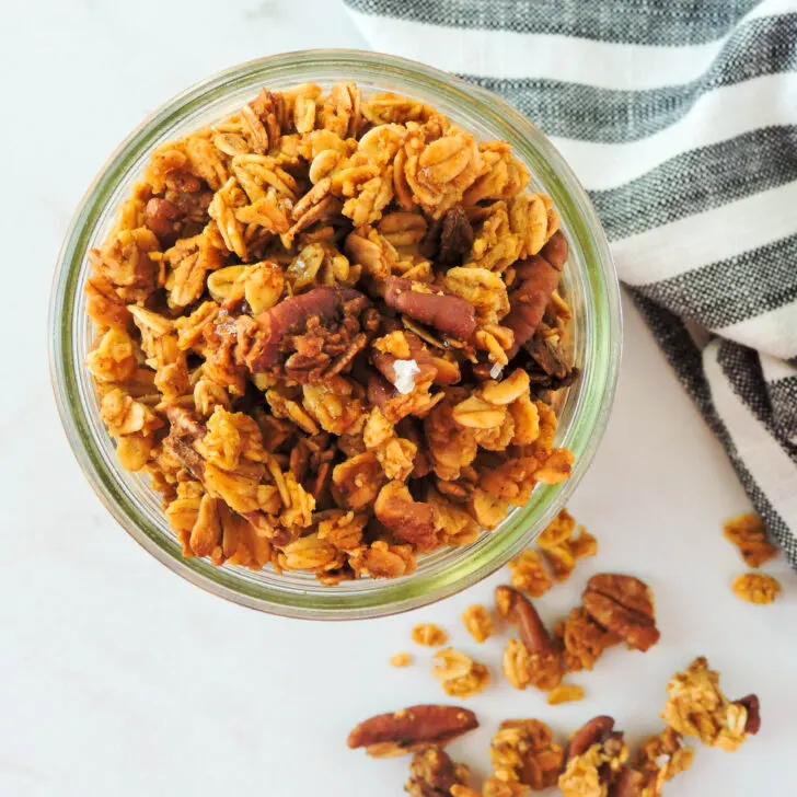 Sweet and salty is my favorite combo and this homemade granola recipe delivers. Pumpkin Pecan Cinnamon Granola is the perfect seasonal treat. Serve it over yogurt, ice cream or just eat it by the handful right out of the jar.