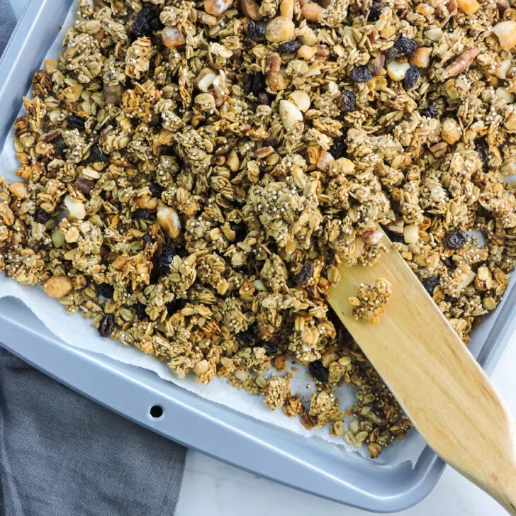- When the granola is done mix in the raisins, whole flax seeds, dates and chia seeds. Allow it to cool completely until it's nice and dry. Store in an air tight container for up to 2 weeks.