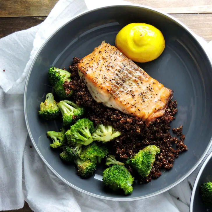 - Plate a bed of the quinoa. Then, the salmon and broccoli. Squeeze the charred lemon half over everything and serve.